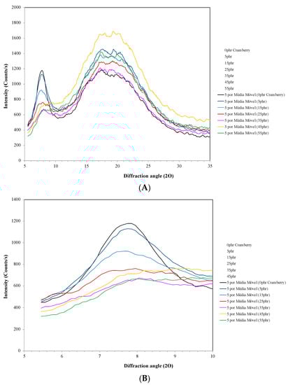 X-ray diffraction of arrowroot starch and gelatin films incorporated with cranberry, 0, 5, 15, 25, 35, 45 and 55%: (A) X-axis scale from 5 to 35; (B) X-axis scale from 5 to 10°.