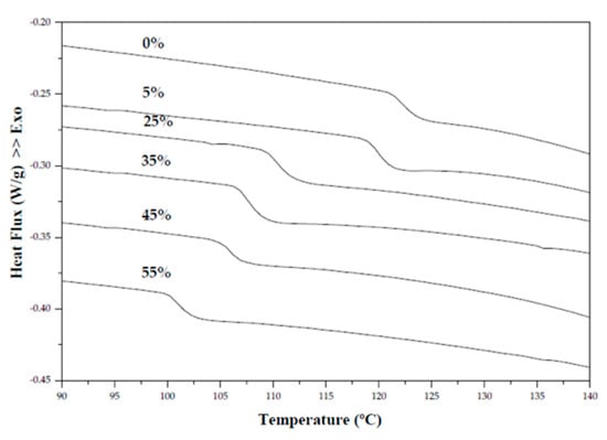 DSC thermograms can be observed in Figure 3. The thermogram of films based on arrowroot starch and gelatin (0%) indicated the beginning of Tg around 121.2 °C; however, the glass transition temperature range decreased when increasing the concentration of cranberry by 5 to 55% in films, indicating Tg around 118.8 and 101.2 °C. Studies have reported that when fruit pulps are incorporated into the polymeric matrix of the film, the sugars found in the fruit will have a possible plasticizing effect [16,40]. In the film, the plasticizer acts by modifying the interaction between the polymers, leading to an increase in the free volume of the system, and consequently to an increase in chain motility and reduction of the glass transition temperature (Tg) of the system [41,42].