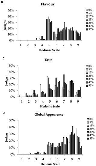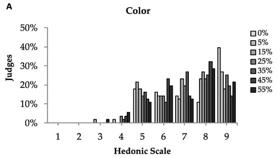 The sensory evaluation of the edible films was performed by 56 untrained tasters. The number of tasters and the order of presentation of samples followed the design of [34], which considers the first-order, carry over effects. The acceptance tests were performed to assess the appearance, colour, flavour, taste and overall acceptance attributes. The film samples were cut into square format (2 cm × 2 cm) and served on a white plate on a white table, monadically and coded with three digits. In the sensory evaluations, the testers evaluated how much they liked or disliked the samples, through a hedonic scale of nine points with the corresponding extremes: “disliked extremely” (1) and “liked extremely” (9).