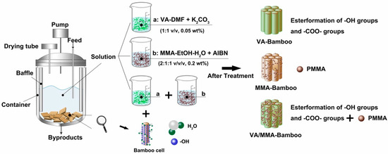 Schematic flow chart of bamboo acetylation, in situ polymerization of MMA on bamboo, and combined treatment of acetylation and in situ polymerization.