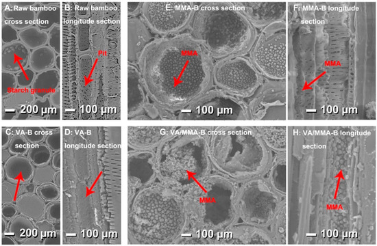 Morphology characterizations of the cross-section and longitudinal section of raw and pretreated bamboo: raw bamboo (A,B), VA-B (C,D), MMA-B (E,F), and VA/MMA-B (G,H).