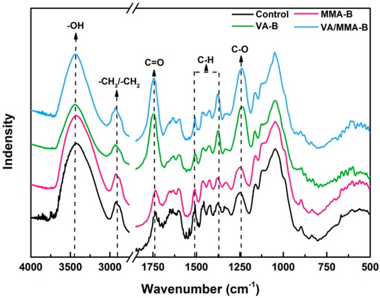 Table 1 shows the effects of using different modification methods on the weight gain rate (WPG) of bamboo, volume bulking efficiency (VBE) of bamboo, and conversion rate (CR) of MMA. WPG reached a maximum of 18.95% after the combined treatment of VA and MMA, and this indicates that more VA and MMA were fabricated on the bamboo. During the VA and MMA treatment process, VA has an active anhydride group that reacts with hydroxyl groups of bamboo components to create monoesters [28,29], and MMA in situ polymerizes on the surface or in a void of bamboo [23]. Ghorbani et al. reported that the WPG of poplar wood increased from 22.71% with the single treatment of maleic anhydride (MAN) and from 51.8% with the single treatment of MMA to 56.05% with the combined treatment of MAN and MMA [34].