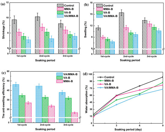 Figure 4 shows the effects of chemical modification on the dimensional stability of bamboo in the three cycles of water soaking–drying experiments. Figure 4 includes data for the volume swelling ratio, volume shrinkage ratio, antiswelling efficiency, and water absorption. Compared to control samples, the volume swelling ratio and volume shrinkage ratio of bamboo treated using the three chemical modification methods all decreased, and this indicates that the dimensional stability of bamboo treated using VA and MMA was improved. Among the three chemical modification methods, bamboo treated with the combination of VA and MMA exhibited the best dimensional stability. The antiswelling efficiency of VA/MMA-B reached a maximum value of 40.71%. We suggested that VA reacts with and deactivates the hygroscopic hydroxyl groups of the cell wall polymers and thereby creates a less polar particle surface, which is for better polymerization [30,34,40].
