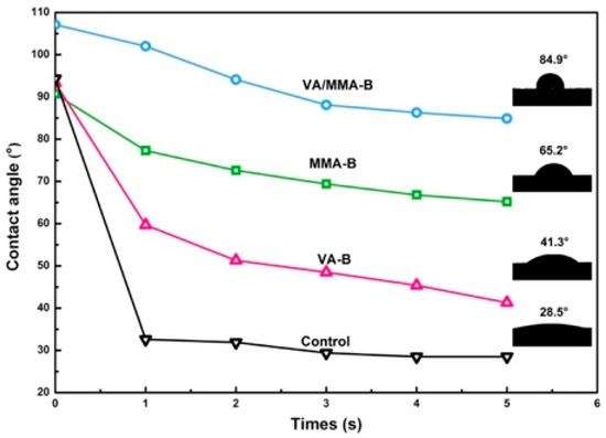 The wettability of raw and pretreated bamboo was evaluated using contact angle analysis (CA), where a large contact angle corresponds to greater hydrophobicity and better dimensional stability [52]. Figure 5 shows the transient profiles of the CA data of raw and pretreated bamboo. For the untreated samples, the initial CA was 94.3°, and then it sharply dropped to 28.5° with an increase in contact time from 1 s to 5 s. After chemical modification, the CA values of VA-B, MMA-B, and VA/MMA-B were 93.3–43.3°, 90.7–65.2°, and 107.1–84.9°, respectively, with varying contact times. Similar to CA data for raw bamboo, the CAs of treated bamboo gradually decreased with an increase in contact time. This result might have been caused by the surface defects of bamboo, where VA and MMA were not uniformly distributed. This defect makes it hard to obtain Young’s equilibrium CA, and the static CA might fluctuate within a range under real conditions [53].