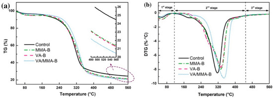 Figure 6 shows the thermal degradation behaviors of raw and pretreated bamboo under a nitrogen atmosphere at a heating rate of 10 °C/min. According to the TG curves, the highest residual mass was observed in raw bamboo (24.5%), followed by MMA-B (21.4%), VA-B (21.3%), and VA/MMA-B (20.4%). The thermal stability of VA and MMA was lower than that of raw bamboo. Therefore, with an increase in the WPG of treated bamboo, the residual mass decreased, but the weight loss rate of the treated bamboo increased.