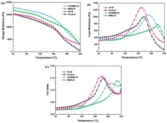 Variations in the dynamic storage modulus (E’), loss modulus (E’’), and loss tangent (tan δ) of raw and pretreated bamboo are shown in Figure 7. The dynamic storage modulus is widely used to assess the load-bearing capability of a composite material [57]. The storage modulus of raw bamboo was about 15,057 Pa. In general, the storage modulus (E’) of all of the bamboo samples decreased with an increase in temperature. It is worth noting that the value of E’ for VA/MMA-B was the highest at the same temperature for each of the four samples (17,909 Pa), and this indicates that the dynamic storage modulus was enhanced after the combined pretreatment using VA and MMA. With an increase in the concentration of acetyl and methyl groups, intermolecular hydrogen bonding was broken. A certain number of hydroxyl groups were then regenerated, and the cellulose chains were consequently closer [32,33,41]. It is believed that the stiffness of the bamboo fibers was enhanced, and the initial storage modulus value of the treated samples is also reflected by this. A similar result has been reported by Jebrane et al. Some esterified material expands into the micropores or lumen of the bamboo cell wall after treatment, and this results in a higher value of E’ [23].