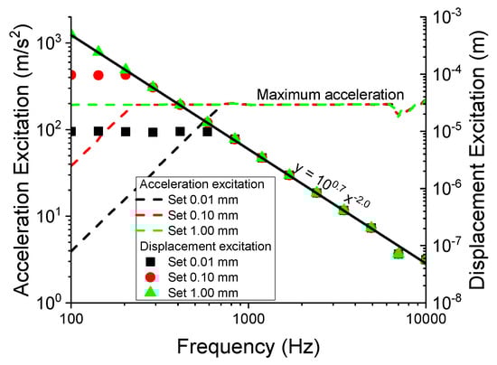 When considering different compounds, it is important to note that the excitation input of the experiment is a function of both amplitude and frequency. There is, however, an instrumental limitation on the excitation since a substantial amount of power would be required to have a large amplitude at higher frequencies. As shown in Figure 1, the displacement excitation is reduced at higher frequency ranges. When the desired excitation amplitude cannot be achieved, a constant base acceleration of 200 m/s is used. The drop in amplitude with respect to frequency can be formulated as follows: