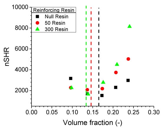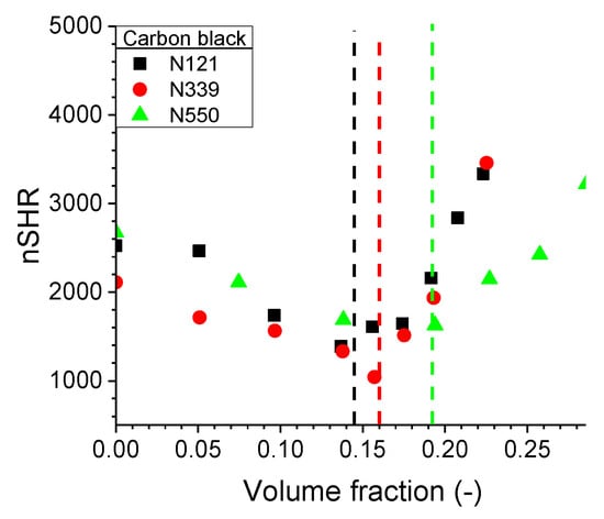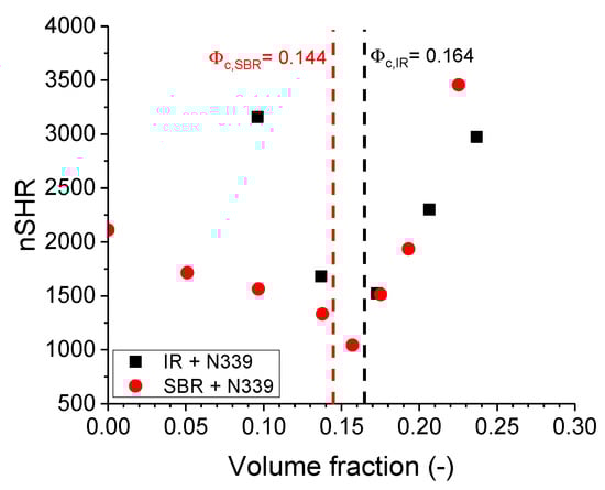The nSHR values for the three resin concentrations in a N339-filled IR compound. Dashed lines indicate percolation threshold values obtained by RPA measurements. Note that the scaling is twice the scale in Figure 4.