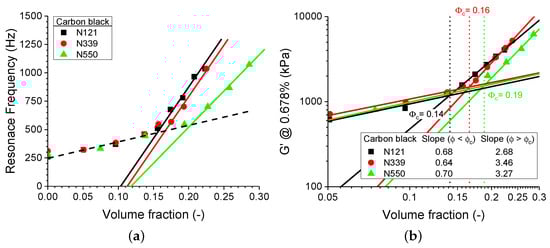 When comparing the resonance frequency in HF DMA with respect to the CB volume fraction, as shown in Figure 3, the onset of the filler network reinforcement as indicated by the percolation threshold can be estimated in analogy to the RPA whereby the deviation of the hydrodynamic reinforcement of the sample determines the percolation threshold. It should be noted from Equation (1) that the resonance frequency is a function of both modulus and geometry. Nevertheless, when comparing the same geometry, the resonance frequency shows a similar strain dependency with respect to CB volume fractions, such is the case for the dynamic strain sweep measurements from the RPA.