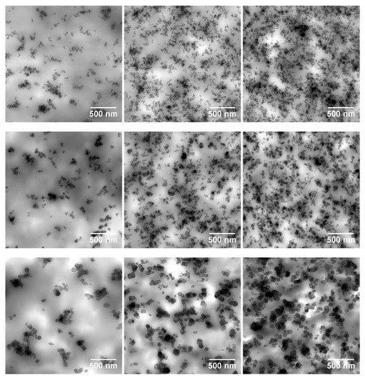 The transmission electron microscopy (TEM) analysis was performed on a JEM1400 Instrument (Jeol, Tokyo, Japan) using a voltage of 100 kV. In order to investigate the CB network structure, samples were measured in the bulk state. Thin slices of approximately 60 nm were prepared by using a cryo-ultramicrotome (Leica EM UC6/EM FC6) equipped with a diamond knife.