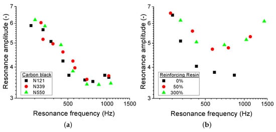 The resonance amplitude as a function of resonance frequency for (a) different carbon black grades within a SSBR matrix without resin and (b) carbon-black-filled IR with three resin concentrations; 0.0, 1.4, and 9.2 parts per hundred rubber.