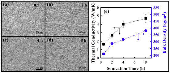 High-resolution scanning electron microscopy (HR-SEM) images of few-walled carbon nanotube (FWCNT) films prepared following ultrasonication for different times: (a) 0.5 h, (b) 2 h, (c) 4 h, and (d) 8 h; (e) thermal conductivity (black quadrangles and arrows) and film bulk density (blue circles and arrows) of FWCNT films with different sonication times.
