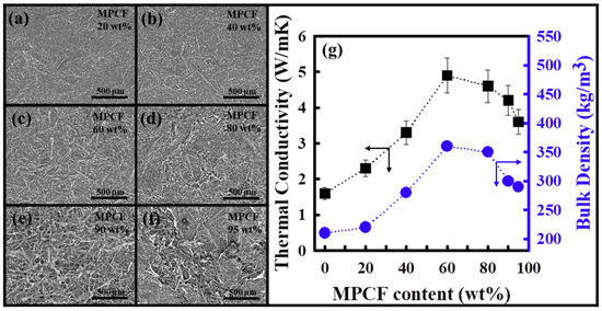 To elucidate the size effect of the 1D-shaped carbon materials on the thermal conductivity of carbon films, FWCNT-MPCF hybrid films were fabricated using the same method as that of the FWCNT films with an ultrasonication time of 0.5 h (milled MPCF length of 200 μm). The surface morphology of the FWCNT-MPCF hybrid films was analyzed by means of HR-SEM, as illustrated in Figure 3a–f. When the MPCF contents were less than 60 wt %, the surface morphology of the films was smooth and the MPCFs were uniformly distributed among the FWCNTs. However, when the MPCF contents were more than 80 wt %, numerous large voids could be observed between the MPCFs due to the small quantity of FWCNTs (Figure S2 of the Supplementary Material). This is because MPCFs with large diameters are relatively stiff, while FWCNTs with very small diameters are more flexible. This phenomenon appears to occur when the MPCF content reaches a critical amount (80 wt % in our case). The thermal conductivity and bulk density of the FWCNT-MPCF hybrid films are presented in Figure 3g. For MPCF contents of less than 60 wt %, the thermal conductivity values of the FWCNT-MPCF hybrid films were linearly proportional to the MPCF content, indicating an obvious synergistic effect on the thermal conductivity by means of the hybridization of two fillers. The FWCNT-MPCF hybrid film with an MPCF content of 60 wt % had the highest thermal conductivity value of 4.91 W/mK (an approximately 200% increase compared to the FWCNT film of 1.65 W/mK). This is because the bulk density of the FWCNT-MPCF hybrid film increased with an increasing MPCF content, and thereby, short and direct pathways for heat transfer were effectively formed. However, for MPCF contents of more than 80 wt %, the thermal conductivity of the FWCNT-MPCF hybrid films decreased, which could be attributed to the increase in the film voids, and thereby, the decrease in the film bulk density, as confirmed in the HR-SEM images. Therefore, it is necessary to form an optimal network structure with both high film bulk density and short heat transfer pathways to obtain a hybrid film with high thermal conductivity.