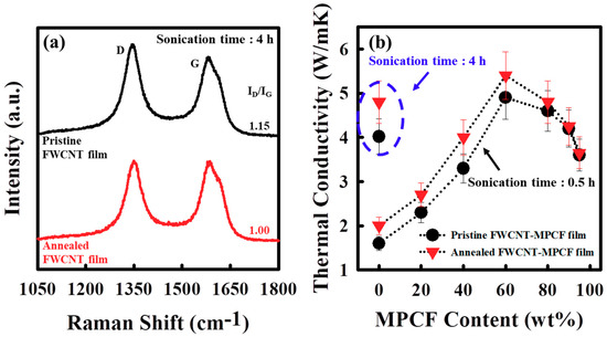 (a) Raman spectra of the pristine and annealed (at 1000 °C) FWCNT films (ultrasonication for 4 h) (The D-band (approximately 1350 cm−1) and G-band (approximately 1580 cm−1) are related to defect-induced structural disorders and sp2 carbons, respectively.); (b) thermal conductivity of FWCNT-MPCF hybrid films with different MPCF content (length: 200 μm; ultrasonication for 0.5 or 4 h) before and after thermal annealing (at 1000 °C).