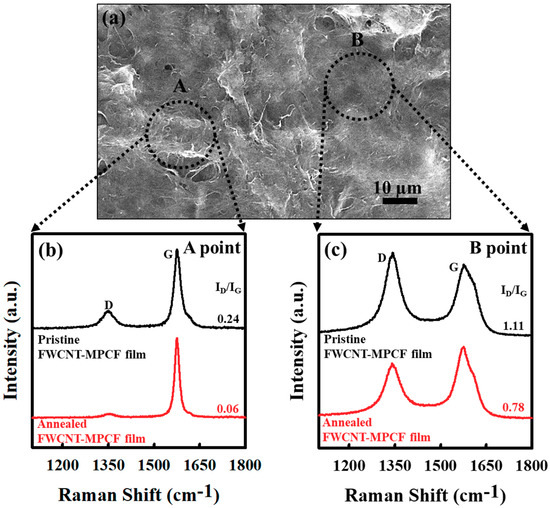 (a) HR-SEM images of FWCNT-MPCF hybrid film with MPCF (length: 200 μm) content of 60 wt % (ultrasonication for 0.5 h); (b,c) Raman spectra at points “A” and “B” of FWCNT-MPCF hybrid film with MPCF content of 60 wt % (ultrasonication for 0.5 h) before and after thermal annealing at 1000 °C. The D-band (approximately 1350 cm−1) and G-band (approximately 1580 cm−1) are related to defect-induced structural disorders and sp2 carbons, respectively.