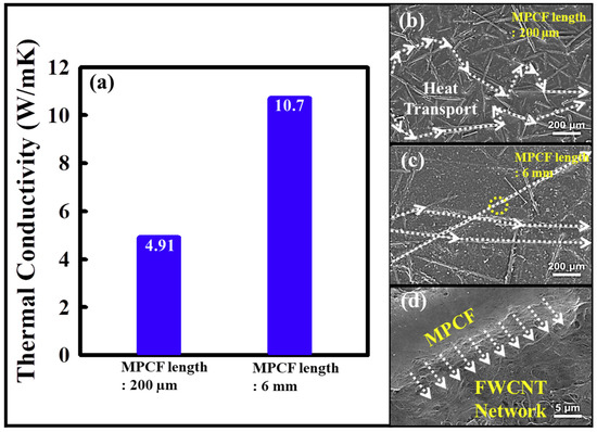 To examine the effect of the MPCF length on the thermal conductivity, FWCNT-MPCF hybrid films were prepared using short-milled MPCFs (200 μm) and long-chopped MPCFs (6 mm) with a 60 wt %, respectively (with an ultrasonication time of 0.5 h). In this case, we selected an ultrasonication time of 0.5 h because of the thermal conductivity comparison in terms of only different MPCF lengths, which was the minimum time required for the formation of the free-standing film in our study. Figure 6 presents the thermal conductivity and HR-SEM images of the FWCNT-MPCF hybrid films prepared with MPCFs of different lengths. The thermal conductivity of the long MPCF film was 10.7 W/mK, which was 118% higher than that of the short MPCF film (4.91 W/mK), as indicated in Figure 6a. As demonstrated in the HR-SEM images shown in Figure 6b, the lower thermal conductivity of the short MPCF film was associated with increased phonon scattering at numerous inter-fiber junctions during the heat transfer. However, the heat transfer pathways of the long MPCF film were shorter than those of the short MPCF film, resulting in reduced resistance in the inter-fiber junctions of the heat conduction network of the FWCNT-MPCF hybrid film (Figure 6c). Based on these results, the main heat transfer pathways were as follows: (1) MPCF to MPCF, (2) MPCF to FWCNT, (3) FWCNT to MPCF, and (4) FWCNT to FWCNT. Among these, the short heat transfer pathway from MPCF to MPCF was the most important pathway for high thermal conductivity, which had the least phonon scattering. Therefore, as the MPCF content in the FWCNT-MPCF hybrid films increased, the heat transfer pathways between the MPCFs became shorter, and thereby, the thermal conductivity increased. Moreover, the FWCNTs in the FWCNT-MPCF hybrid films could act as thermal bridges between neighboring MPCFs for the formation of effective heat transfer pathways (Figure 6d). Therefore, if the amount of nanometer-sized FWCNTs is excessively small, the heat transfer pathways between the MPCFs and FWCNTs are cut off, and the thermal conductivity decreases.