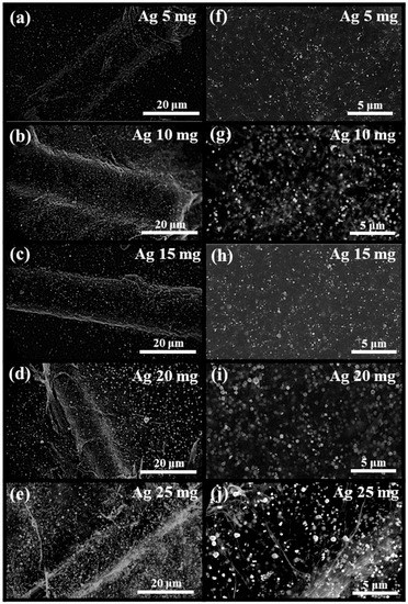 HR-SEM images of the FWCNT-MPCF-Ag hybrid films incorporated with different Ag contents of: (a,f) 5 mg (9.1 wt %), (b,g) 10 mg (16.6 wt %), (c,h) 15 mg (23.0 wt %), (d,i) 20 mg (28.6 wt %), and (e,j) 25 mg (33.3 wt %) (MPCF length: 6 mm; MPCF content: 30 mg; FWCNT content: 20 mg; ultrasonication for 0.5 h). (a–e) are low-magnification images, while (f–j) are high-magnification images.