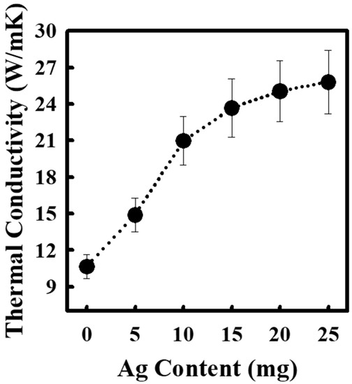 According to the previous results, the thermal conductivities of carbon-based films are closely related to the intersection points in the random network of thermally conductive FWCNTs and MPCFs. Therefore, to reduce the phonon scattering at the intersection points between the thermally conductive carbon-based materials, Ag nanoparticles were incorporated into the FWCNT-MPCF hybrid films (MPCF length: 6 mm). The Ag nanoparticles used were in the form of organic Ag with amine groups to increase dispersibility in the solvent. Following the formation of free-standing FWCNT-MPCF hybrid films incorporated with organic Ag nanoparticles, the amine groups were removed by heat treatment at 300 °C (air atmosphere). The TGA result indicates that the weight loss of the Ag nanoparticles at 300 °C was 4.3 wt %, as illustrated in Figure S3 of the Supplementary Material. The surface morphology of the FWCNT-MPCF-Ag hybrid films was observed by HR-SEM, the images of which are presented in Figure 7a–j. It can be confirmed that the Ag nanoparticles were uniformly distributed in the FWCNT-MPCF-Ag hybrid film. The average Ag nanoparticle size was approximately 300 nm, which was measured using the HR-SEM images (Figure S4 of the Supplementary Material). According to the thermal conductivity measurement, the thermal conductivity of the FWCNT-MPCF-Ag hybrid films increased dramatically from 10.7 to 25.8 W/mK by adding Ag nanoparticles of 25 mg (33.3 wt %), and proportionally increased with an increase in the contents of the incorporated Ag nanoparticles in the FWCNT-MPCF hybrid films, as illustrated in Figure 8. This result clearly demonstrates that the Ag nanoparticles could act as a thermal bridge for the heat transfer between the carbon materials, thereby reducing the phonon scattering and increasing the thermal conductivity of the carbon-based hybrid films.