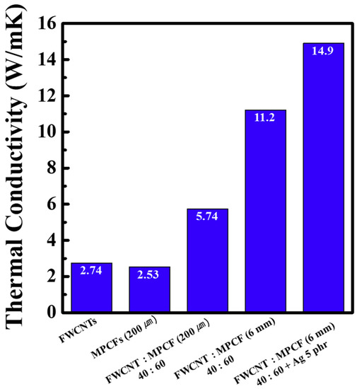 Thermal conductivity of epoxy-based composites containing only FWCNTs, only MPCFs (200 μm length), FWCNT-MPCF hybrids (MPCF length of 200 μm or 6 mm; FWCNT:MPCF weight ratio of 40:60), and MWCNT-MPCF-Ag hybrids (MPCF length of 6 mm; FWCNT:MPCF weight ratio of 40:60; Ag content: 5 phr). The total loading amounts of MWCNTs and MPCFs in the epoxy-based composites were adjusted to 10 wt %.