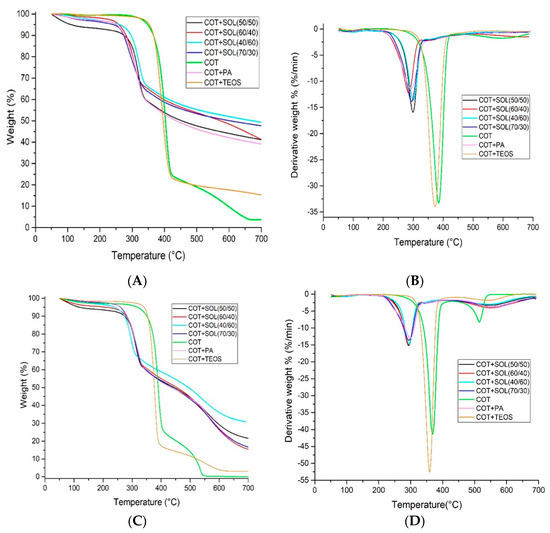 TGA was employed for evaluating the thermal and thermo-oxidative stability of untreated and treated cotton fabrics. TONSET, the maximum weight loss temperature (Tmax1 and Tmax2), the residue at the maximum weight loss temperature, and the final residue at 700 °C are collected in Table 2 and Table 3. Figure 7(A–D) shows the corresponding TG and dTG curves. In inert atmosphere (nitrogen), the decomposition of the untreated cotton takes place according to a single main degradation step; the degradation onset occurs at about 358 °C, and the maximum degradation rate is observed at 386 °C (Table 2). The sol–gel coating is responsible for an anticipation of the cellulose decomposition temperature, as revealed by Tmax and TONSET, which are shifted toward lower values. These shifts are more pronounced when phytic acid is present in the deposited coating, as it starts decomposing prior to the decomposition of the cellulosic substrate. This finding was already found for cotton fabrics treated with biomacromolecules [14,21]: In doing so, the flame-retardant coating activates, hence favoring the formation of a stable residue (char), able to act as a thermal barrier, instead of the formation of volatile combustible species that could further promote the degradation of the cellulosic substrate [28]. This effect is also very noticeable when cotton is treated with phytic acid only (COT + PA sample, for which the residue at 700 °C approaches 37%). From an overall point of view, the final residue for all the treated fabrics is remarkably higher with respect to the untreated counterpart, again confirming the protection exerted by the deposited hybrid coatings.