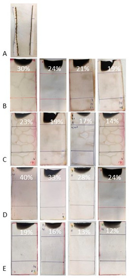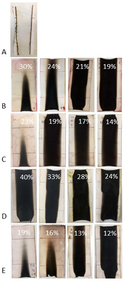 Residues after vertical flame-spread tests. (A) COT, (B) COT + SOL (50/50), (C) COT + SOL (60/40), (D) COT + SOL (40/60), and (E) COT + SOL (70/30). The dry add-ons are reported on each image.