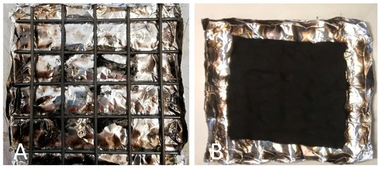 First of all, the high solubility of phytic acid in water causes the almost complete loss of the flame-retardant coating after washing, which results in significant weight losses for all the hybrid coated systems. COT + TEOS exhibits, in fact, the lowest weight loss after washing (13%). As a partial conclusion, these preliminary tests seem to indicate that the design hybrid coatings are not durable and therefore suitable for laundry occasions. In turn, this finding significantly affects the flammability of the treated fabrics, as shown in Table 9, which collects the results of the horizontal flame-spread tests performed on the washed fabrics. More specifically, all the treated fabrics, after washing, are not able to achieve self-extinction, though they still show some flame-retardant properties, witnessed by the lower burning rates and the higher final residues as compared to untreated cotton. It is possible to observe that, although the fibers burn completely (i.e., the applied flame propagates through the entire specimen length), the texture of the fabric is still maintained, and the residue is coherent (Figure 13). This finding indicates that the hybrid coating remained on the fabrics after washing still exerts a certain protection on the underlying fabric.