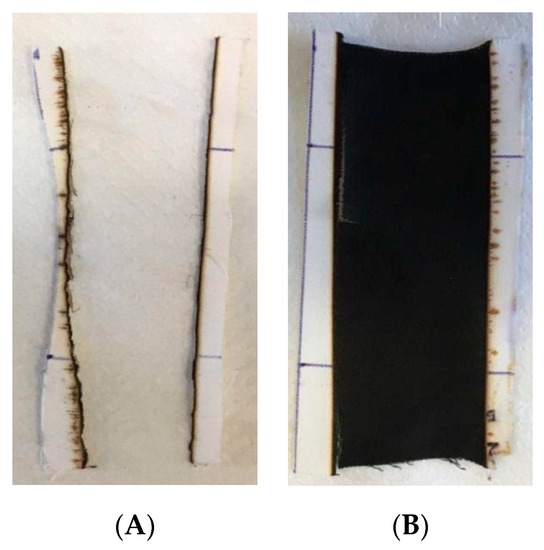 Residues after horizontal flame-spread tests for untreated cotton (A) and COT + SOL (70/30) (B) after washing treatment.