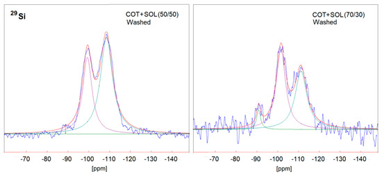 Solid state 29Si NMR spectra of COT + SOL (50/50) (left) and COT + SOL (70/30) (right) after washing.