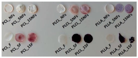 Figure 2 illustrates the qualitative results of ninhydrin staining. Among aminolyzed samples, only PCL nanofibers were unstained, what is in agreement with quantitative results (Figure 1b). In the case of PLLA film, highly effective aminolysis was accompanied by degradation, which is manifested by higher brittleness.