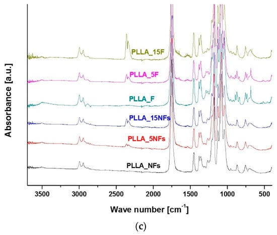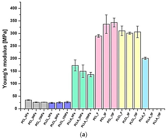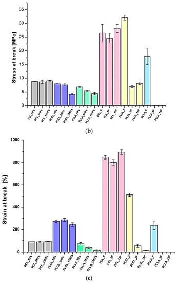 Drop of the stress at break was noticed by us for all samples except PCL nanofibers and films, with a tendency to be more significant for longer times of the aminolysis treatment (Figure 6b). This stress at break reduction is a result of effective aminolysis, as evidenced directly by ninhydrin tests. The trends in the stress at break correspond with changes in the strain at break, with most visible reduction after the aminolysis treatment for PLLA nanofibers and PLCL films being as dramatic as from 511 ± 14.41% for PLCL_F to 13.6 ± 1.55% for PLCL_15F (Figure 6c).