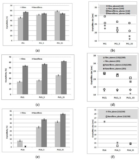 Crystallinity and crystal size of: (a,b) PCL, (c,d) PLCL, (e,f) PLLA.
