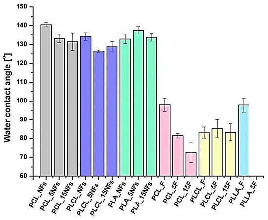Figure 7 shows results of water contact angle (WCA) measurements. For PCL and PLCL nanofibers, a slight decrease in WCA after the aminolysis treatment was observed. In the case of PCL—from 140.55 ± 1.21° for pristine to 133.18 ± 2.21° for 5 min and 131.51 ± 4.67° for 15 min of the treatment. For PLCL nanofibers, the values of water contact angle were as follow: 134.27 ± 2.04°, 126.46 ± 0.64°, and 128.95 ± 2.55° for pristine and treated for 5 and 15 min samples, respectively. For PLLA nanofibers, 5 min of the treatment led to even an increase in WCA from 132.9 ± 2.48° for the pristine sample to 137.52 ± 1.92°. The general observation is that water contact angles are generally lower for film samples. After the treatment, a significant decrease of water contact angle was visible for PCL films. In the case of PLCL film, the values were almost unchanged. For PLLA films, it was impossible to measure water contact angle due to complete degradation.