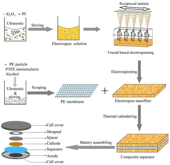 - Liang, X.; Yang, Y.; Jin, X.; Huang, Z.; Kang, F. The high performances of SiO2/Al2O3-coated electrospun polyimide fibrous separator for lithium-ion battery. J. Membr. Sci. 2015, 493, 1–7. [Google Scholar] [CrossRef]