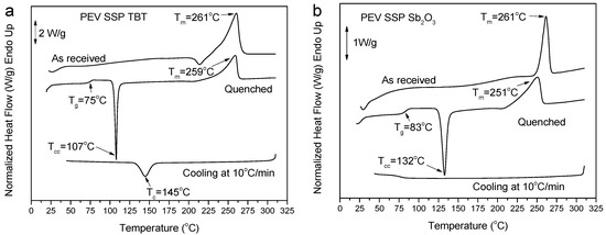 - Minakov, A.A.; Mordvintsev, D.A.; Schick, C. Melting and reorganization of poly(ethylene terephthalate) on fast heating (1000 K/s). Polymer 2004, 45, 3755–3763. [Google Scholar] [CrossRef]
