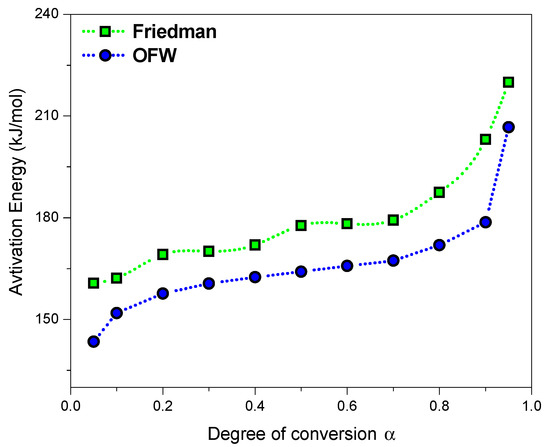 - Starink, M.J. The determination of activation energy from linear heating rate experiments: A comparison of the accuracy of isoconversion methods. Thermochim. Acta 2003, 404, 163–176. [Google Scholar] [CrossRef]