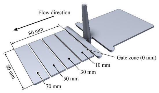 In order to investigate segregation, we cut the injection-molded flat specimens into four equal 20 mm wide parts along the flow path (Figure 1). In this way, we were able to examine the amount of filler in four segments along the flow path.