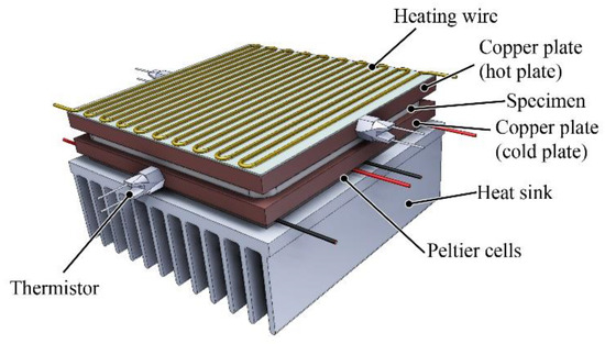 The thermal conductivity was measured with a hot plate apparatus, which we developed earlier [24]. The cold plate of the apparatus was cooled by four Peltier cells. The hot plate was heated by a heating wire. The temperature was measured with two thermistors on each side (Figure 2). During the measurement process, a steady state condition in heat flow has to be achieved, and then the one-dimensional case of Fourier's law can be used: