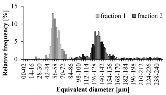 In both cases, we managed to create a relatively narrow size range (Figure 3). In the nominal range of 0–75 µm, we had beads between 45 µm and 75 µm, and the peak was at 55 µm. In the 125–250 µm range, the glass beads are characteristically between 120 µm and 165 µm. There were very few beads over 165 µm. Beads under 125 µm probably remained due to the short sieving time. This fraction is characterized by a peak of 135 µm.