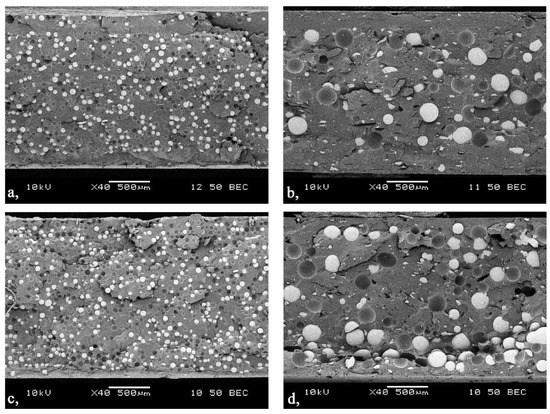 With a scanning electron microscope we examined the distribution of the glass beads across the cross section of the injection-molded samples containing 20 vol % glass beads (GB). The purpose of the micrographs was to show whether the flow of the melt affects segregation through the cross section. Figure 4 shows that the smaller beads are distributed almost uniformly through the cross section, both at the beginning and the end of the flow path. At the same time, near the gate, on the surface of the sample, a 100–150 µm thick layer formed, which had less filler in it. At end of the flow path, this layer disappeared. When larger glass beads were used, the layer with fewer beads at the beginning of the flow path was thicker, about 200–250 µm, and the larger beads were in the middle of the cross section. At the end of the flow path, this phenomenon was not perceptible—larger particles appeared near the surface, too. This proves that the size of filler particles affects segregation through the cross section.
