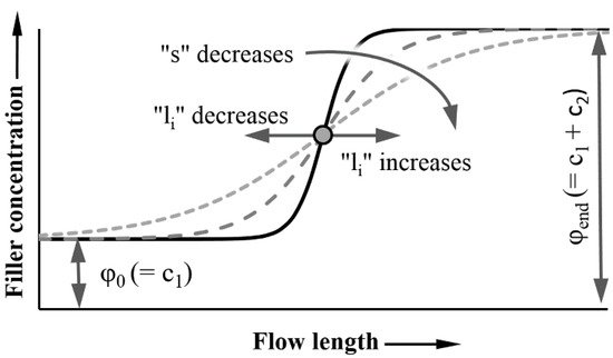where ϕ (l) (vol %) is the local filler content, l (mm) is the measurement position in the sample (flow length), measured from the gate, c1 is the minimum of the curve, c2 is the range of the function, l (mm) is a variable parameter giving the current position along the flow path, li (mm) is the inflexion point of the curve, and s (1/mm) is the slope of the transient section.
