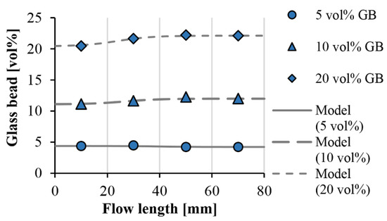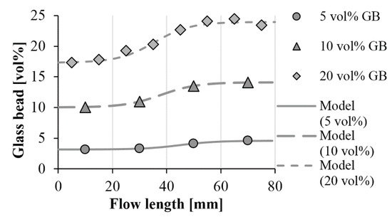 In our case, the c1 parameter of Equation (5) is the glass bead content at the beginning of the flow path (ϕ0 (vol %)) (Equation (6)).
