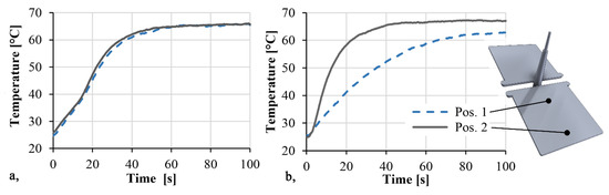 We proved the effect of inhomogeneous distribution on thermal conductivity with a FLIR A325sc (FLIR Systems, Wilsonville, OR, USA) thermal imaging camera. We placed the 20 vol % GB samples from the different series on a 70 °C metal plate and measured the surface temperatures of the samples as a function of time near the gate and at the end of the flow path, with a thermal imaging camera (Figure 10). The emission coefficient was set to 0.95. In the case of small beads, where segregation is negligible, the temperature increased at both ends of the product at the same rate. The average heating rate between 30 °C and 50 °C was 1.1 °C/s. In the case of 120–165 µm beads, the difference was considerable. We measured an average heating rate of 0.7 °C/s at the beginning of the flow path, while at the end, it was 2.3 °C/s, which is due to segregation.