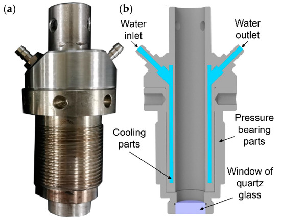 The granular sample was melted and stably delivered to the slit sample cell, which was installed on the front of the extruder. Because of the high-temperature and -pressure environment inside an extruder, a high-temperature/pressure-resistant shell (Figure 1) equipped with a water channel was designed to protect the Raman probe. The high-temperature/pressure-resistant shell is composed of pressure-bearing parts (external) and cooling parts (internal). A quartz glass window is adhered to the stainless-steel parts at the front with epoxy resin. The high-temperature/pressure-resistant shell not only cooled the Raman probe to ensure its regular operation, but also provided a window for the acquisition of the Raman signal in the extruder. The laser from the 785 nm laser was irradiated onto the molten sample through the window of the high-temperature/pressure-resistant shell along the excitation fiber of the Raman probe. The Raman signal generated from the sample passed through the window into the collection fiber of the Raman probe, and was, subsequently, collected by the Raman spectrometer. The Raman spectrum of each sample was averaged over 20 scans with a resolution of 4 cm−1 over the wavenumber range from 1600 cm−1 to 600 cm−1. In addition, the power of the laser was at a rate of 400 mW. To obtain a high signal-noise ratio (SNR), the distance of the laser spot to the melt surface was set 0 mm, and the single scan time was set to 3 s [23]. The raw spectrum was pretreated by the chemometrics methods to correct baselines and eliminate unwanted noise.