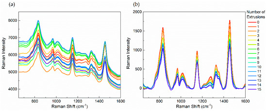 In-line Raman spectra of polypropylene (PP) with different numbers of extrusions. (a) raw spectra, (b) spectra pretreated by baseline correction.