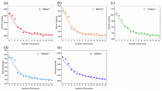 Variations and fitting curves of Raman intensity in PP main characteristic bands with different numbers of extrusions. (a) 832 cm−1, (b) 967 cm−1, (c) 1150 cm−1, (d) 1324 cm−1, (e) 1454 cm−1.