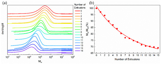 Results of GPC in PP with different numbers of extrusions. (a) Variation of Molecular weight distribution curve, (b) variation of Mwi/Mw0. MWi is the weight average molecular weight of the i-th extrusion.