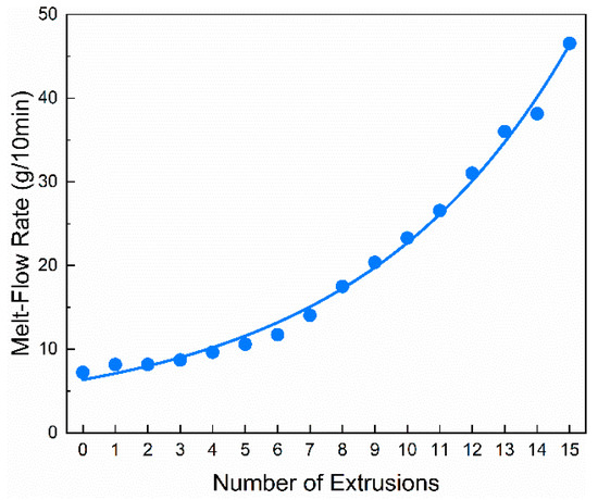 Variations of melt-flow rate (MFR) in PP with different numbers of extrusions.