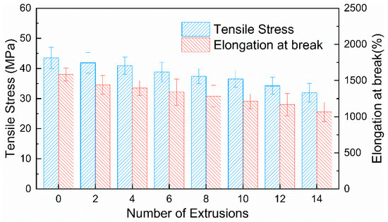 Vibrational modes for Raman characteristic Bands of PP are shown in Table 1. Variations of Raman intensity in PP main characteristic bands with different numbers of extrusions are shown in Figure 3. Raman intensities of 1324 and 1454 cm−1 bands gradually decrease with an increasing number of extrusions, indicating the decrease in the –CH2– group. In addition, the similar variation in spectral intensity has been observed in bands of 832, 967 and 1150 cm−1, suggesting the decrease of the C–C. These spectral variations show that chains of PP are damaged by the mechanical stress during the extrusion process. By means of multiple extrusions, the scission of the PP chain mainly results in the decrease in molecular weight [25,26]. As shown in Figure 4, it can be found that Mw decreases with the increasing number of extrusions, which indicates the scission of the PP chain. The molecular weight decreases as the degree of degradation increases, the number of chain scissions increases as the number of extrusions increase. Macroscopically, the scission of the molecular chain is reflected in the increase of the MFR [27] and the decrease of the tensile properties [5] as well. As shown in Figure 5 and Figure 6, with the increasing number of extrusions, the MFR increases and the tensile properties decreases, suggesting the scission of the molecular chain.