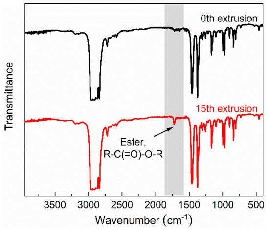 A similar variation in spectral intensity is observed in the band of –CH3 vibration. As shown in Figure 3, Raman intensities of 832, 967, 1324 and 1454 cm−1 bands show a clear decrease, suggesting the decrease of the –CH3 group. Because of the low activation energy of the alkyl radical of PP (80–110 kJ/mol), free radicals are easily initiated in an aerobic environment [29]. Considering that the extrusion process of PP is performed in a natural atmosphere, the decrease of the –CH3 group indicates that free radicals may be terminated with oxygen-containing functional groups instead of –CH3 groups. Therefore, oxidative degradation may happen in the extrusion. According to Figure 7, FTIR spectra of degraded PP for different numbers of extrusions, the ester functional group has a clear peak (1740 cm−1) in the sample of the fifteenth extrusion [3]. This result indicates that the PP has undergone oxidative degradation and esterification of carboxylic acids with alcohol has occurred at the termination stage.