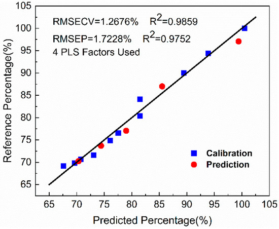 Therefore, as a good PLS model, values of RMSECV and RMSEP are expected to be as small as possible. In addition, according to Equation (9), the closer the coefficient of determination (R2) is to 1, the more accurate the PLS model is.